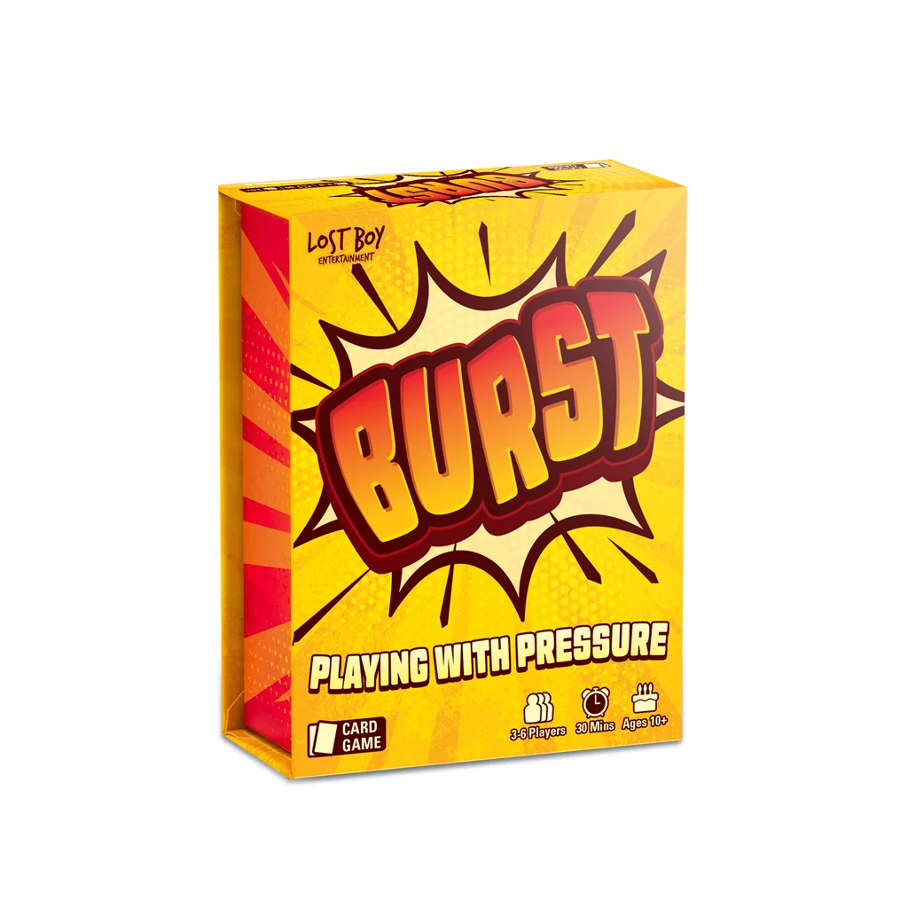 Burst, een explosief partyspel! Elke beurt trek of speel je een kaart, maar als het totaal aantal gespeelde kaarten hoger is dan 21, ontplof je! De ronde eindigt dan meteen en je tegenstanders scoren. Tussen bluffen en risicomanagement belooft Burst snelle en afwisselende spelbeurten. Pas op voor onverwachte wendingen want het spel bevat speciale kaarten en die effecten kunnen alles veranderen!