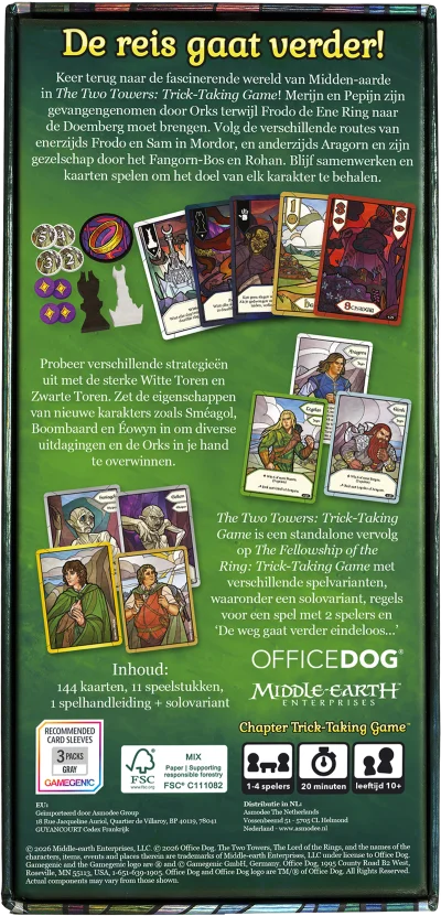 De reis gaat verder in de magische wereld van Midden-aarde in The Two Towers: Trick-Taking Game, een verhaalgedreven coöperatief kaartspel waarin spelers de rollen aannemen van helden en schurken in Tolkiens legendarische werk 'The Two Towers'. Deze op zichzelf staand kaartspel is een vervolg op The Fellowship of the Ring: Trick-Taking Game uit 2025 met de hoofdstukken 19-36. De hoofdstukken kunnen in willekeurige volgorde worden gespeeld en het is niet verplicht om de eerdere versie te spelen, maar idealiter speel je ze in volgorde.