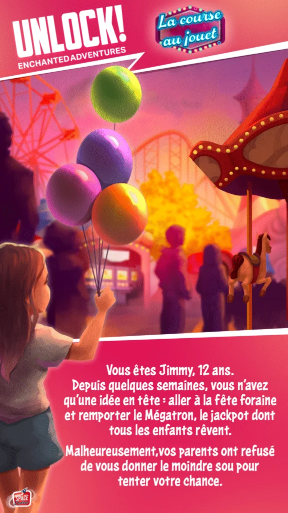 - La Course au Jouet (niveau 2) : votre plus grand rêve ? Gagner le gros lot de la fête foraine. Mais sans un sou et avec la foire qui ferme demain, vous allez tenter le tout pour le tour... avec seulement votre lance-pierres en poche !